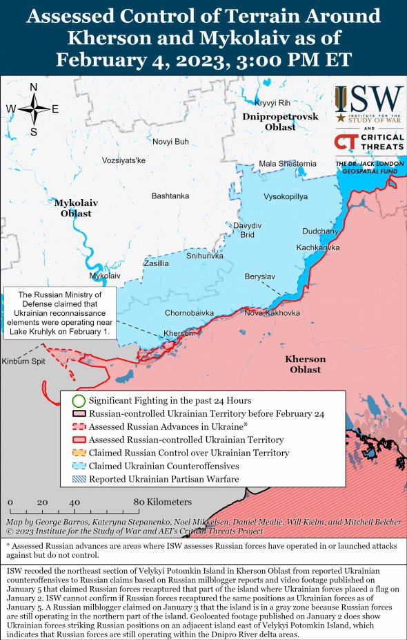 Тим часом українські Збройні сили можуть готувати локалізований контрнаступ в районі Вугледара. Про це свідчать карти бойових дій, оприлюднені вранці 5 лютого американським Інститутом вивчення війни.