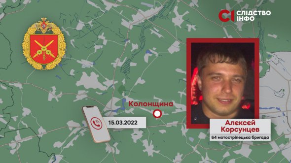 Ще один окупант із 64-ї бригади - єфрейтор 31-річний Алєксєй Корсунцев - 15 березня, імовірно, телефонував із села Колонщина Бучанського району.