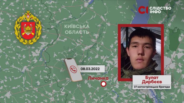 Ще один окупант із 37-ї бригади - рядовий 22-річний Булат Дирбєєв. 8 березня його номер телефону зафіксувала базова станція в селі Личанка в Бучанському районі.
