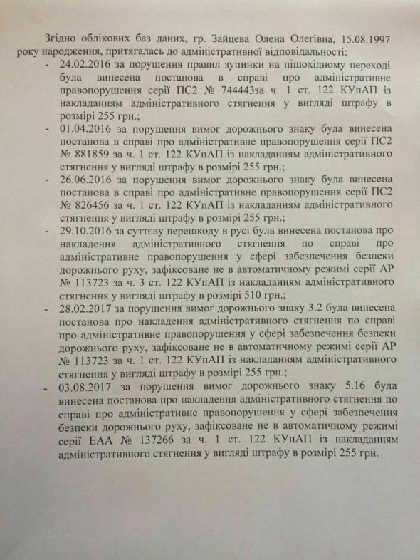 Олексій Мочанов опублікував в Facebook список порушень 20-річної Олени Зайцевої, яка була за кермом чорного Lexus