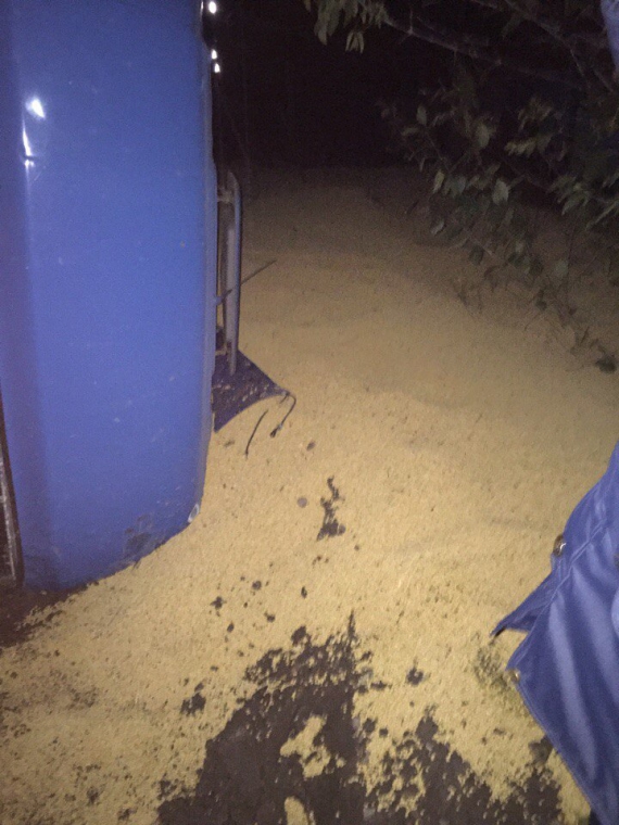 Припускають, що причиною аварії стала мокра дорога. Водій не впорався із керуванням великогабаритним авто. Соя висипалася із причепа на узбіччя дороги.