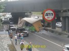 У Києві на просп. Перемоги завантажена газоблоками фура протаранила автомобіль та врізалася в шляхопровід поблизу станції метро Берестейська. Аварія сталася 1 липня.