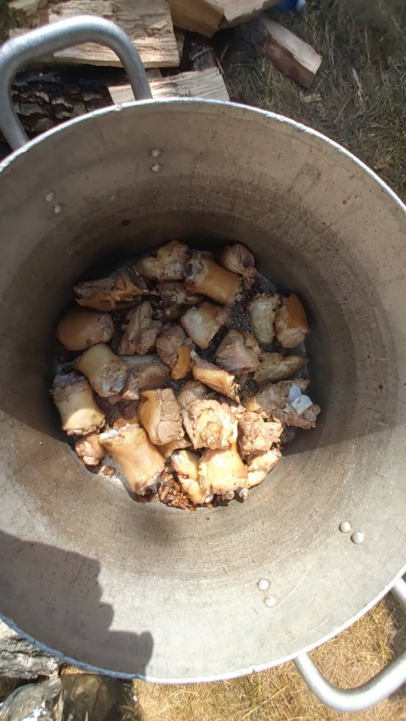 "Потрібні смачнючі овочі, які можуть вирости лише на родючій українській землі. Тоненько нарізаємо українське бандерівське сало, яке можуть дати лише вгодовані українські свині. Обсмажуємо та додаємо ситне українське м'ясо. З усією лютою ненавистю до клятих москалів нарізаємо цибулю і обсмажуємо її в жирі. Кубиками нарізаємо моркву і додаємо овочі. Заливаємо бульйон. Годинку тушкуємо. І мрійливо гадайте: скільки за цю годинку знищено російської техніки та самих москалів. Додаємо спеції та часничку. І чекаємо, доки наш справжній закарпатський бограч доводиться", – розповів прикордонник.