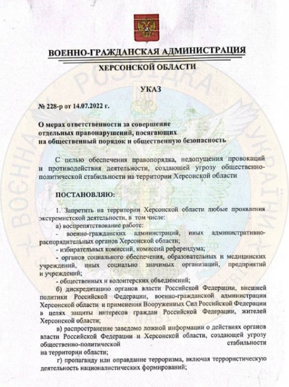 "Виданий наказ "Про заходи відповідальності за здійснення окремих правопорушень, що зазіхають на громадський порядок і громадську безпеку". У "документі" йдеться про заборону діяльності, яка перешкоджає роботі окупаційних адміністрацій, "виборчих комісій" та інших органів, створених рашистами на окупованих землях. Заборонена "дискредитація органів влади РФ" і будь-яка інформаційна пропаганда, спрямована проти окупаційної влади", – інформує розвідка.