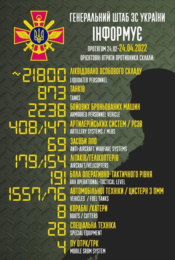Втрати російських окупантів в Україні станом на 24 квітня становлять орієнтовно 21,8 тис. осіб.