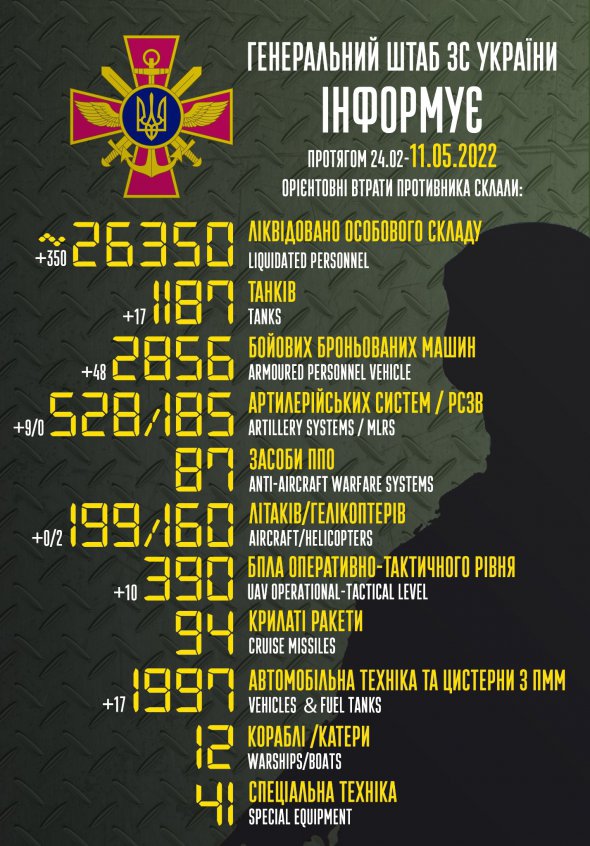 Втрати російських окупантів в Україні на 11 травня становлять приблизно 26 тис. 350 осіб.