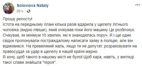 "Істота на передньому плані кілька разів вдарила у щелепу літнього чоловіка (видно лівіше), який очікував, поки його машину розблокує "герой парковки". Він та я чекали як мінімум 10 хвилин. Я і ще один свідок пропонували постраждалому написати заяву до поліції, але він відмовився. На превеликий жаль, якщо ти не депутат, розраховувати на правосуддя за удар в щелепу в нашій країні марно. Хай кара, навіть у вигляді такої слави, знайде "героя", - написала у Facebook свідок інциденту Наталія Соловйова, опублікувавши відповідне фото.