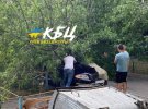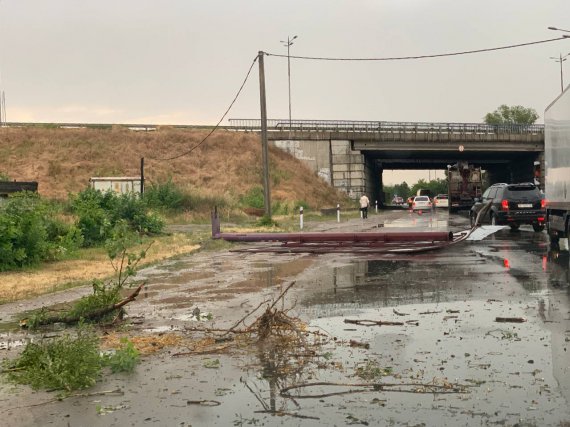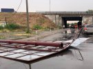 Негода супроводжувалася шквалами. Перед Жулянським мостом сильний вітер повалив рекламний борд.