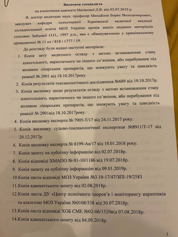 Основою кримінального провадження стане висновок психіатра-нарколога Бориса Михайлова - доктора медичних наук, професора кафедри психотерапії Харківської медичної академії післядипломної освіти. Він вивчив документи у справі та заявив: Зайцева перебувала під дією лікарських препаратів із наркотичним ефектом. І для визначення цього не треба знати кількість опіатів - достатньо лише факту наявності препарату в організмі, а нормативно-правових документів, які б визначали кількість наркотичних речовин, в Україні не існує. Про це у Facebook повідомила журналіст Тетяна Доцяк.