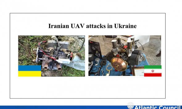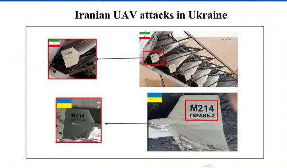 "Це дрон "Шахед-136", який презентували на аукціоні в Ірані в грудні 2021 року, подивіться на хвіст і крила дрону, і порівняйте його з тим, що було знайдено в Україні. Це точно той же продукт, але він прихований кириличними літерами. Однак, навіть шрифт такий самий", – сказав Герцог.