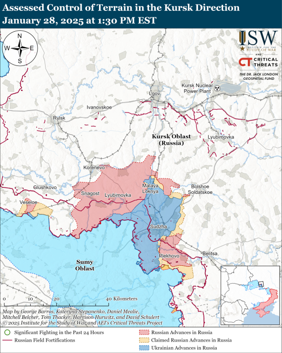 Війська РФ 28 січня продовжили наступальні операції в межах "українського плацдарму" в Курській області, але не просунулися.