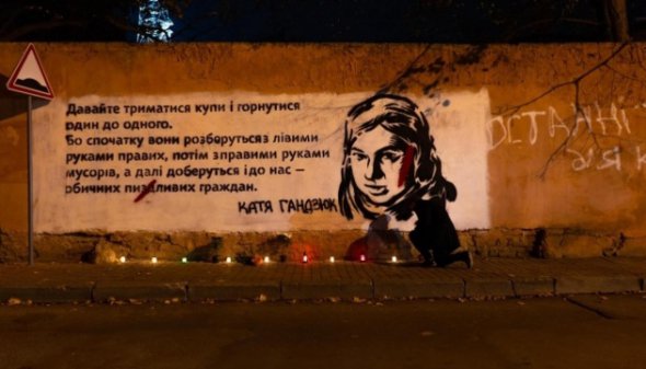 Мурал із зображенням вбитої херсонської активістки Каті Гандзюк був створений на стіні Львівського державного університету внутрішніх справ. Про те, як комунальники лопатами зішкрібають зображення зі стіни, розповіла активістка Меланія Подоляк на своїй сторінці у Facebook.