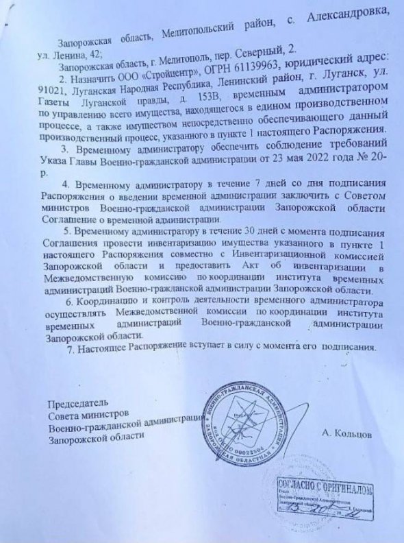 Він опублікував документ ‒ розпорядження так званого "голови ради міністрів ВЦА Запорізької області" про введення "тимчасової адміністрації" для управління майном мережі магазинів.