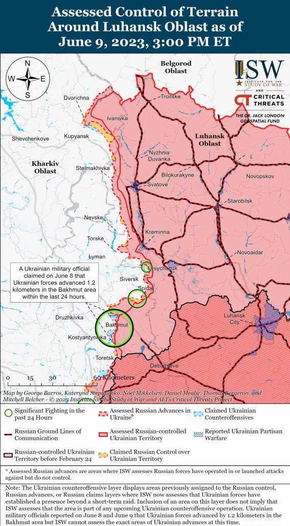 "9 червня українські війська продовжували контрнаступальні операції як мінімум на чотирьох ділянках фронту. Російські війська відбили обмежені та локальні атаки українських військ у районі Кремінної. Українські офіційні особи заявили, що 8 червня ЗСУ просунулися на 1,2 км під час наступальних наступальних операцій під Бахмутом", - йдеться у повідомленні експертів ISW.