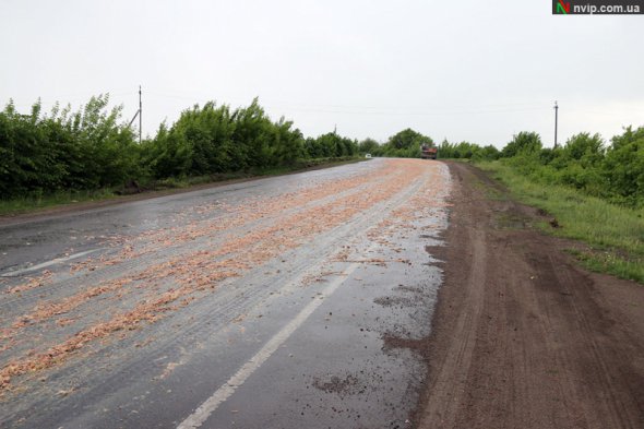 Зазначають, що кишки й інші відходи розкидані на дорозі приблизно 10-сантиметровим шаром, десь на 100 м. Водій підприємства говорить, що на ходу ввімкнувся підйомник кузова.