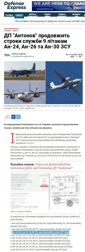 Спеціалізовані авіаційні ЗМІ наприкінці липня повідомляли, що командування Військово-повітряних сил уклало контракт з заводом "Антонов" на продовження терміну служби дев'яти військовим літакам, пише Страна.