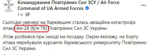 Авіакатастрофа з літаком ВСУ Ан-26 сталася в п'ятницю, 25 вересня. Літак розбився при заході на посадку. Загинули 22 людини. Двоє отримали важкі травми. Ще 4 зникли безвісти.