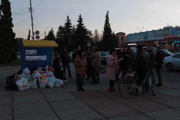 Біля напнутого посеред площі намету стоять понад 20 пакетів із гуманітарною допомогою, яку принесли місцеві.