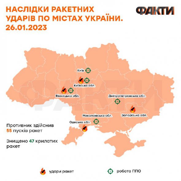Уранці 26 січня Росія почала завдавати масованого ракетного удару. Вибухи лунали у низці областей та Києві.