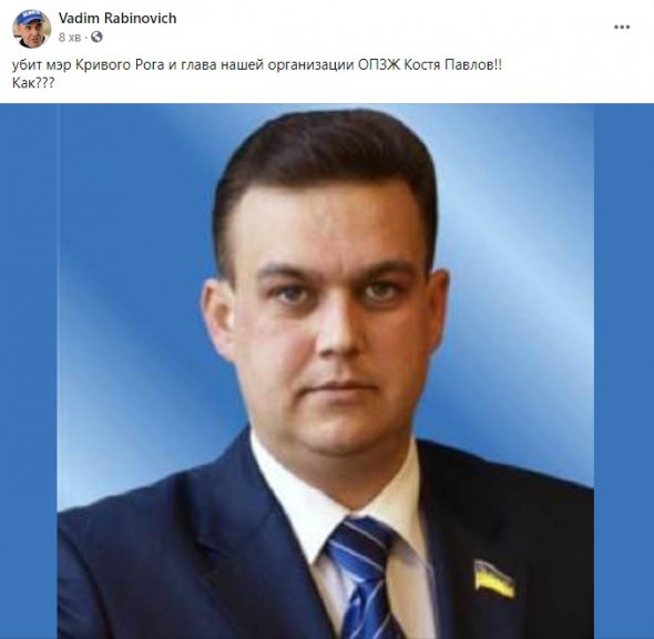 Міського голову Кривого Рогу Костянтина Павлова вбили. Про це заявив у Facebook нардеп від ОПЗЖ Вадим Рабінович.