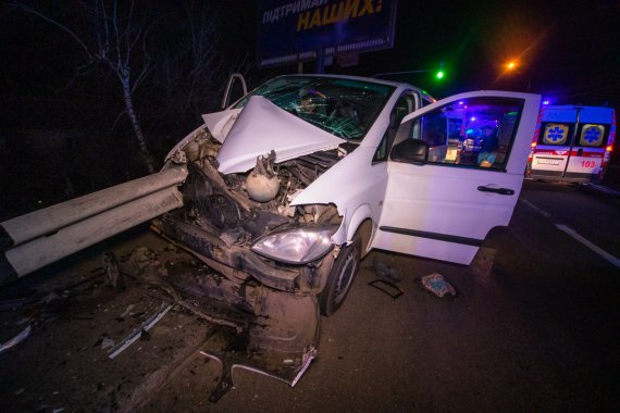 У ніч проти 1 квітня в Києві на Столичному шосе автомобіль Mercedes Vito вилетів з дороги зіткнувся з відбійником. Металева конструкція пронизала мікроавтобус.