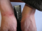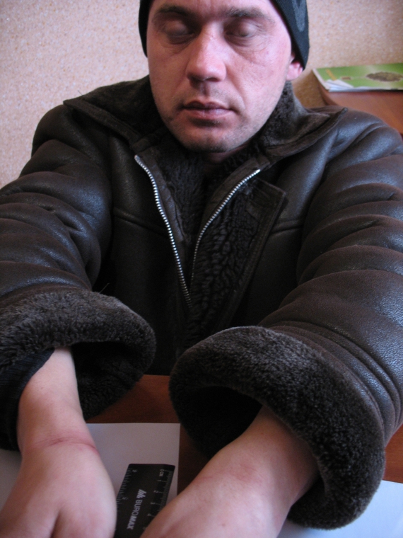 "Мене привезли до п'ятиповерхового приміщення. Я їм показав свої руки, по яких текла кров, так як в них врізались кайданки. Хлопці зняли наручники й дали змити кров з рук, після чого завели в кабінет і почали бити по голові півторалітровою пляшкою з водою. Я відчував запаморочення та сильний біль. Били також долонями рук по голові, вимагаючи, щоб я зізнався в передачі наркотиків та мобільних телефонів на тюрму й в крадіжках. Я їх запевняв, що нічого такого не робив. Вони погрожували, що підкинуть мені наркотики й посадять мене в тюрму", - сказав Сергій Семенович.