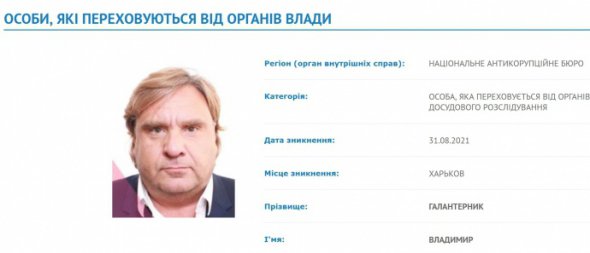 Галантерник зник у Харкові 31 серпня 2021 року і тепер переховується від органів досудового розслідування. Такі дані внесло НАБУ в базу даних МВС.