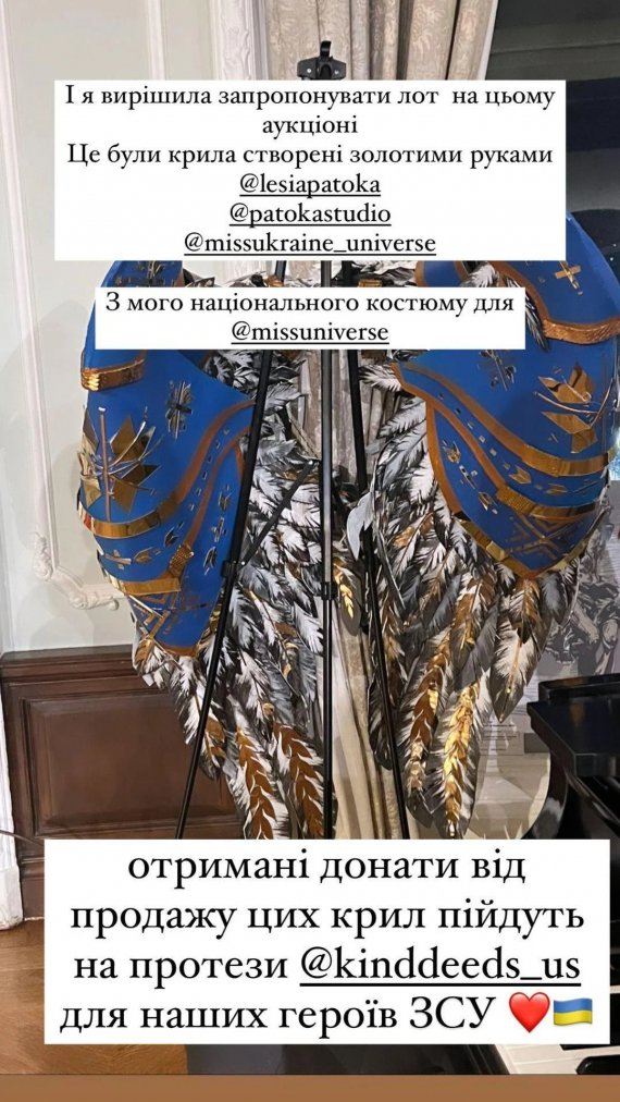 "Я вирішила запропонувати лот на цьому аукціоні. Це були крила, створені золотими руками Лесі Патоки. З мого національного костюма для "Міс Всесвіт", – повідомила Вікторія.