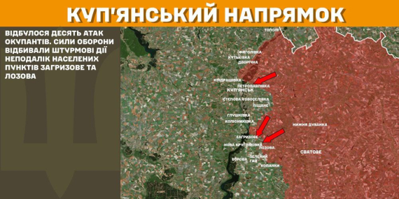 На Куп'янському напрямку минулої доби відбулося десять атак окупантів. Сили оборони відбивали штурмові дії неподалік населених пунктів Загризове та Лозова.