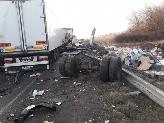 "В умовах ожеледиці сталася дорожньо-транспортна пригода за участі 11 транспортних засобів. До ДТП потрапила 5 вантажних, 5 легкових автомобілів та 1 рейсовий автобус сполученням "Варшава - Херсон". В останньому перебувало 20 пасажирів з яких ніхто не постраждав", - розповіли рятувальники.