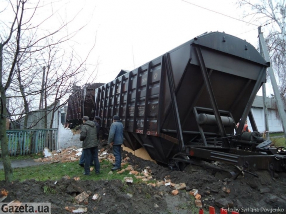 "Цей старий вагон долетів аж до асфальту. Метрів п'ять їхав по землі, нарив купу ям. В ґрунт і встряг, - продовжила жінка. - Зараз його відтягли, й досі стоїть посеред вулиці, перекрив дорогу. З інших вагонів працівники залізної дороги цілий день вантажили кукурудзу на трактор".