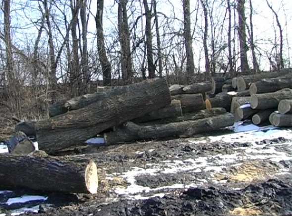 Зрубані дерева селяни перевезли на місцевий склад. Він цілодобово охороняється.