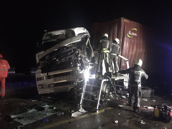 "24 грудня о 4:50 до оперативно-диспетчерської служби Аварійно-рятувального загону спеціального призначення надійшло повідомлення про дорожньо-транспортну пригоду на 88-му кілометрі автодороги. По прибуттю рятувальниками встановлено, що зіткнулося 2 вантажівки марки DAF та Mersedes, водій автомобіля DAF загинув на місці, іншому водію необхідна допомога із деблокування. Рятувальниками за допомогою гідравлічних інструментів (ножиців, домкрату та комбінованого інструменту) деблоковано потерпілого чоловіка 1977 року народження та тіло загиблого водія іншого автомобіля 1987 року народження", - сказано в повідомленні.