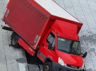 Яма значних розмірів. Вантажівка вгрузла в неї на всю довжину двома колесами.