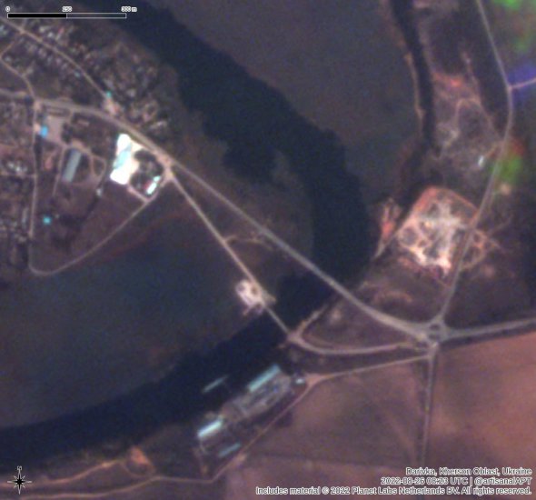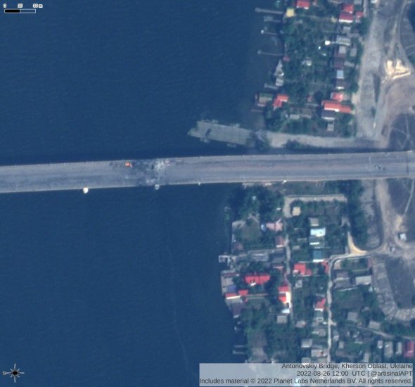 Також Ерхарт показав супутниковий знімок Дар'ївського мосту через річку Інгулець у Херсонській області. Пошкоджень не помітно через погану якість.