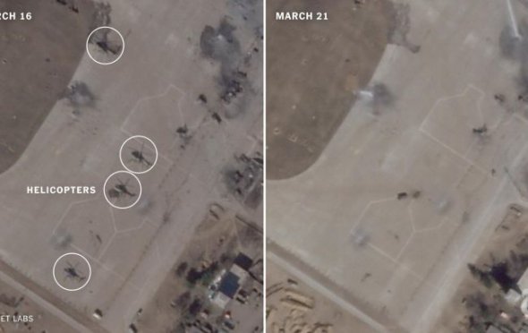 На знімках компанії Planet Labs від 16 березня на аеродромі добре видно російські вертольоти. На фото від 21 березня їх вже немає.