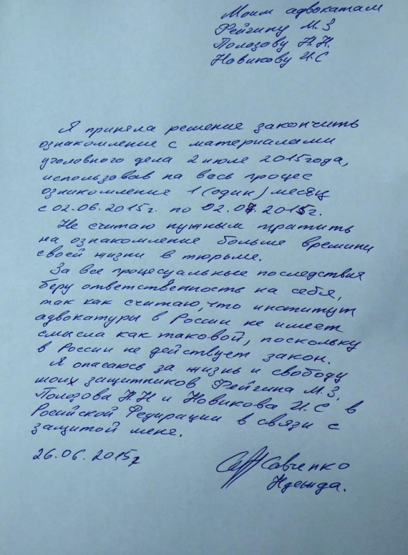 "Я прийняла рішення завершити ознайомлення з матеріалами кримінальної справи 2 липня 2015 року", - написала вона.