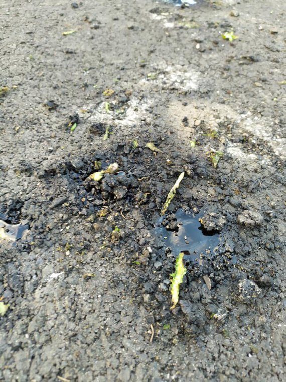 "Швидка реакція на попередню публікацію. Приїхали два турки, які клали асфальт на вулиці Зелена, з сокирою. Вирубували траву на дорозі й залили дірки смолою. І сказали, що в нас в Україні сильна трава", - написала Олена.