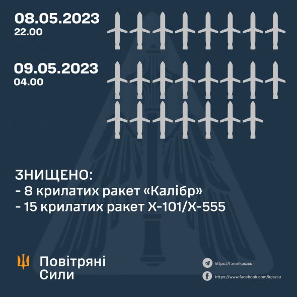 У ніч на 9 травня Сили оборони України збили 23 з 25 ракет, які окупанти запустили за дві хвилі атаки.