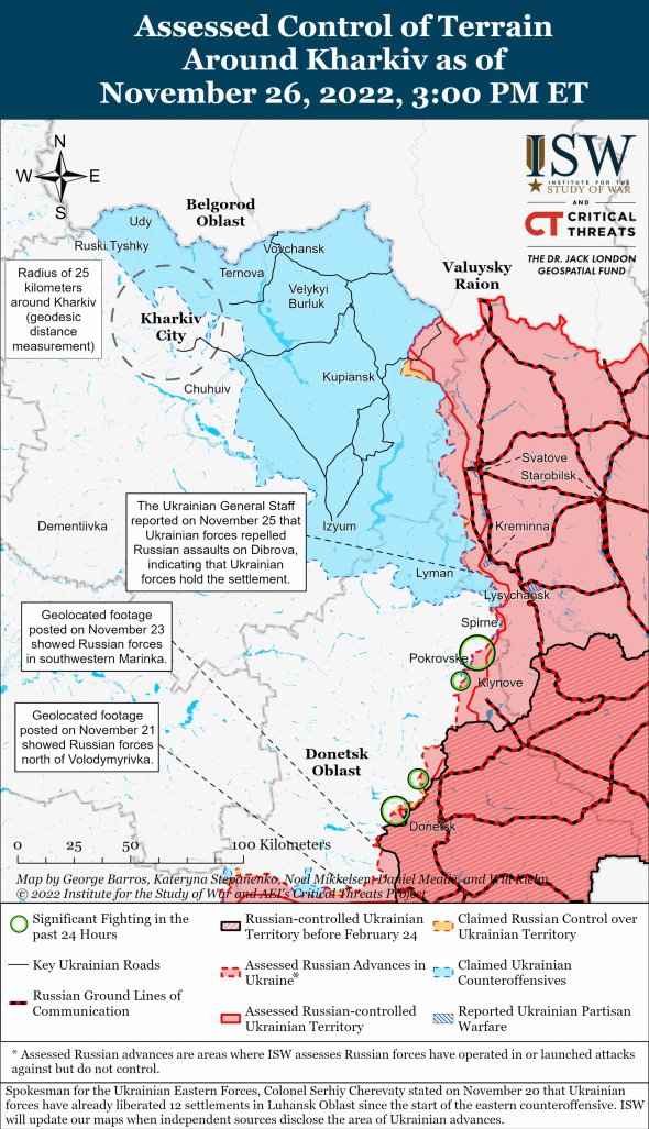 26 листопада російські війська продовжують оборону від контрнаступу українських військ на лінії Сватове-Кремінна. У Генштабі України повідомили, що російські війська ведуть активну оборону на північний захід від Сватового в напрямку Куп'янська та на захід від Кремінної в напрямку Лиману.