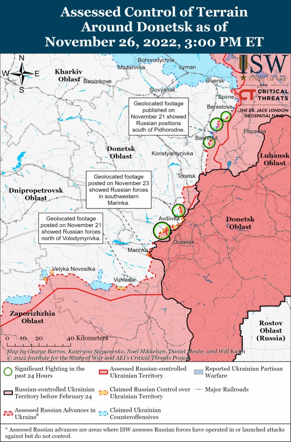 Також російські війська продовжили наступальні дії на лінії Авдіївка-Донецьк. У Генштабі України повідомили, що українські війська відбили наступ росіян у 23 км на південний захід від Авдіївки в районі Первомайського, Красногорівки та Невельського. За словами одного з російських військових блогерів, війська окупантів також продовжили наступ у напрямку Новомихайлівки (36 км на південний захід від Авдіївки). Крім цього, на відео з геолокацією, опублікованому 26 листопада, видно, як українські війська завдають ударів по наступаючим російським танкам на південний захід від Новоселівки Другої, що за 9 км від Авдіївки.