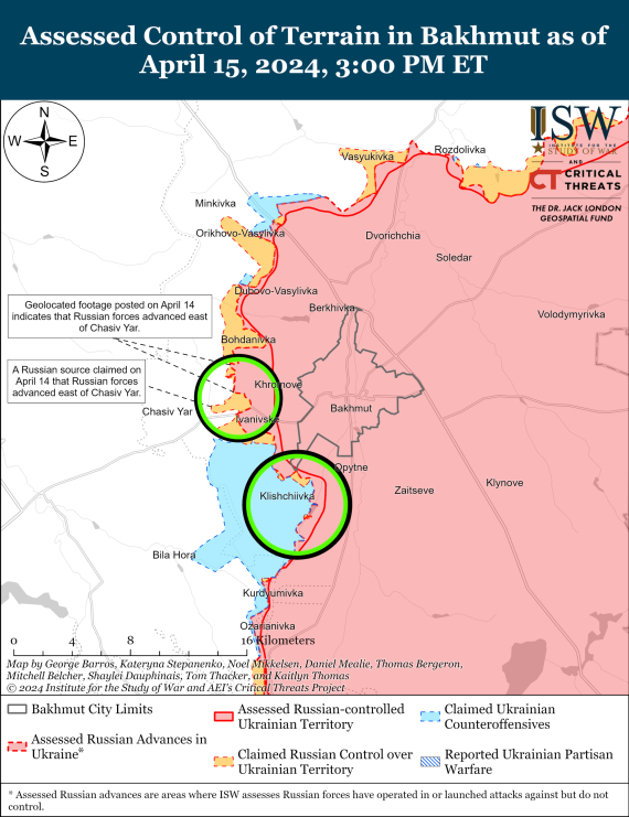 Російські джерела стверджували, що війська РФ нібито просунулися в районі Часового Яру 15 квітня, але підтверджених змін лінії фронту в цьому районі не було.
