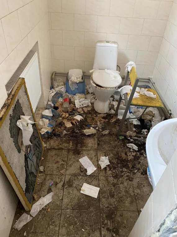 "Всюди – лайно, всюди бігають миші. У вбиральні російські військові справляли потребу повз унітази, а поруч поставили портрет Тараса Шевченка, який спеціально забруднено фекаліями", – повідомив краєзнавець.