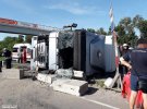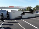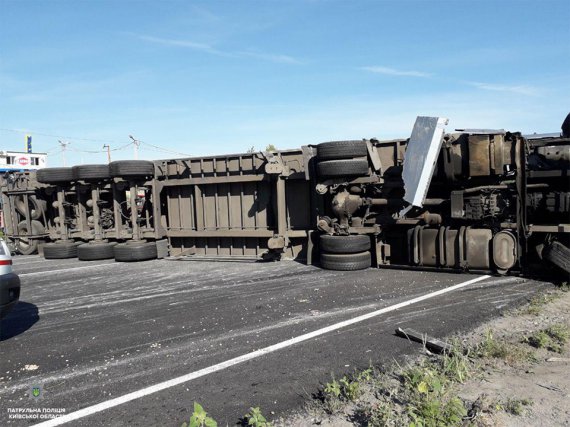 У результаті зіткнення вантажівка перекинулася і заблокувала рух відразу двох смуг. Водій отримав травми, його забрали до лікарні, повідомляє прес-служба патрульної поліції Київської області.