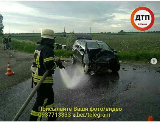 "Серйозна ДТП з постраждалими в Київській області, Бориспіль. Попередньо, на Окружній, водій одного з автомобілів на перехресті сильно виїхав, водій другого легковика не встиг зреагувати. Підсумок: одна машина в кюветі, другу гасили бійці ДСНС, водій госпіталізований у важкому стані" , - йдеться у повідомленні.