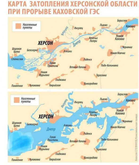Станом на 07:30 повністю або частково затоплені Тягинка, Львове, Одрадокам'янка Бериславського району, Іванівка, Микільське, Токарівка, Понятівка, Білозерка, мікрорайон Острів міста Херсона Херсонського району.