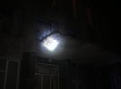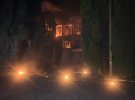 На фото видно понівечену будівлю та уламки дрона, які палають.