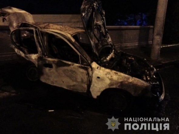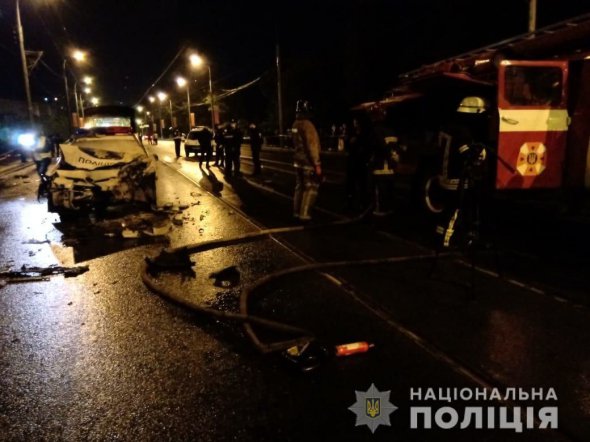 Одному з правоохоронців вдалося вибратися з пошкодженої службової машини. Він гасив полум'я автомобільним вогнегасником, але полум'я одразу охопило Daewoo Lanos.