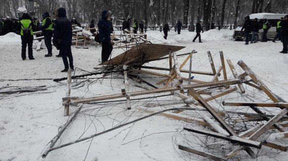 Поліція почала розбирати намети і барикади. Посилаються на слідчі дії, пошук зброї. Підігнали 17 автозаків.