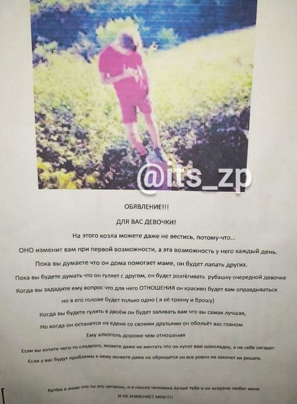 У Запоріжжі дівчина помстилася колишньому хлопцю за зраду. Вона розклеїла на вулицях міста "викривальні" оголошення про його поведінку. В оголошенні були і фотографії. Про це повідомили в соцмережах очевидці.